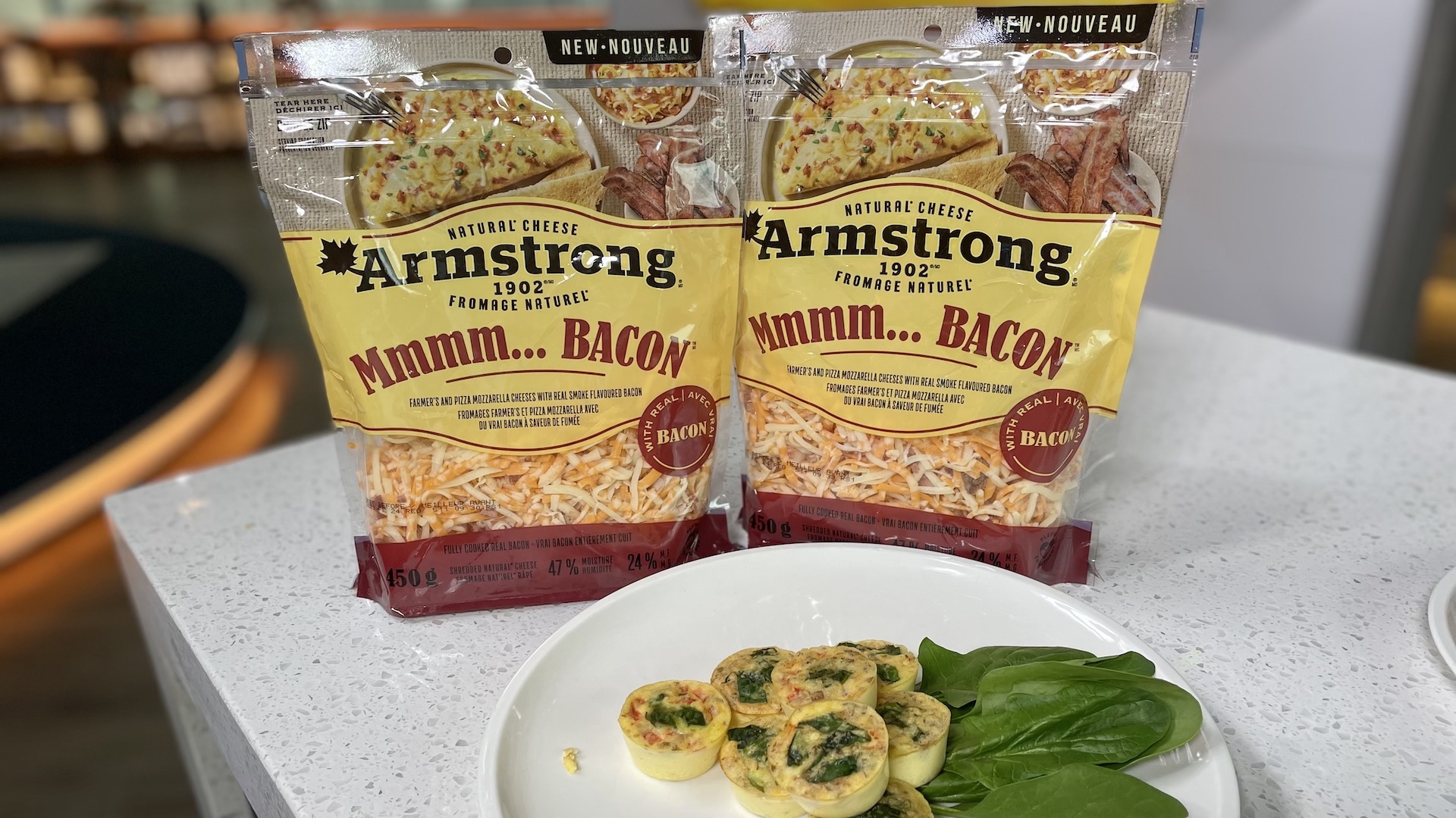 Sauté spinach in olive oil, remove and chop loosely. Roast pepper, clean and dice. Crack eggs in a bowl, and place into a blender with milk and ArmstrongMmmm Bacon shredded cheese blend. Blend and season, add pepper and spinach and portion into muffin tins. Bake in a water bath at 340 until lightly cooked through. (16-20 minutes depending upon oven.)